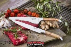 Laguiole Frans koksmes (olijf houten handvat) inclusief luxe zwart houten kistje.Een ideale starterset voor iedereen die wilt overstappen naar betere messen. Het mes is een echte alleskunner en is geschikt voor groenten, fruit, vlees en vis. Uiteraard heeft ook dit Frans koksmes het beroemde Laguiole ontwerp compleet met bij en markering op het lemmet. Het olijfhouten handvat geeft het mes karakter en het heeft hierdoor een tijdloos design. verpakt in luxe zwart houten kistje. Olijfhouten handvat. Niet geschikt voor in de vaatwasmachine