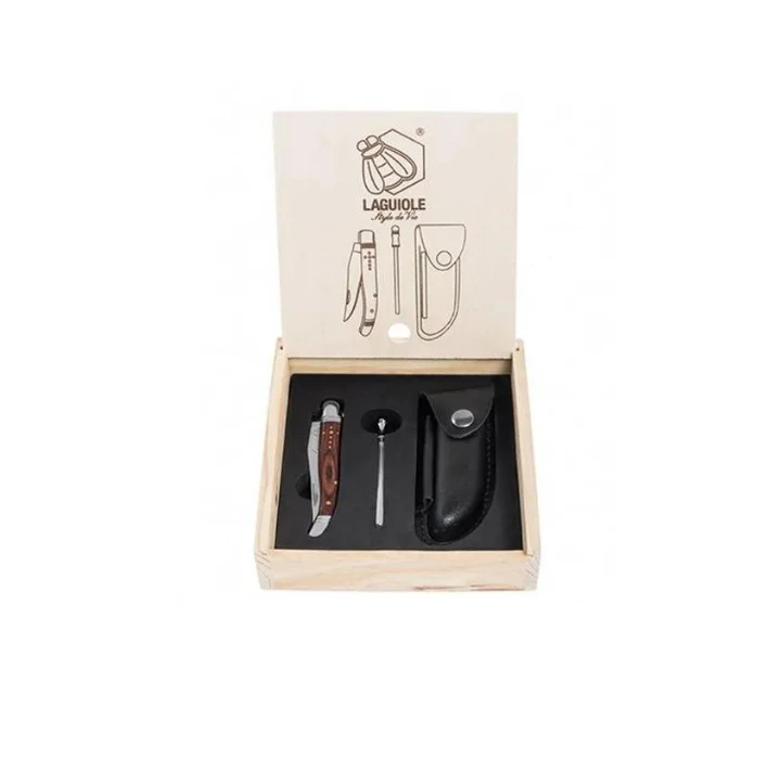 Dit Laguiole zakmes heeft het klassieke Franse ontwerp met een handvat van rozenhout. Een fantastisch cadeau om te geven (of te krijgen) want deze set bestaat uit het zakmes, een handig klein aanzetstaaltje en een leren etui. Daarbij komt de set in een houten geschenkverpakking.