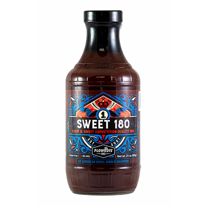Sweet 180 Kansas City-style saus is gemaakt voor competitie met complexe smaken. Deze saus hielp Pork Pullin ‘Plowboys een perfecte 180 KCBS-kip scoren die voor het eerst in de competitie werd gebruikt. Het heeft ook sauswedstrijden op het circuit gewonnen. Het is het beste op ribben, kip of varkensvlees. Het kan echter worden gebruikt voor een brisket.